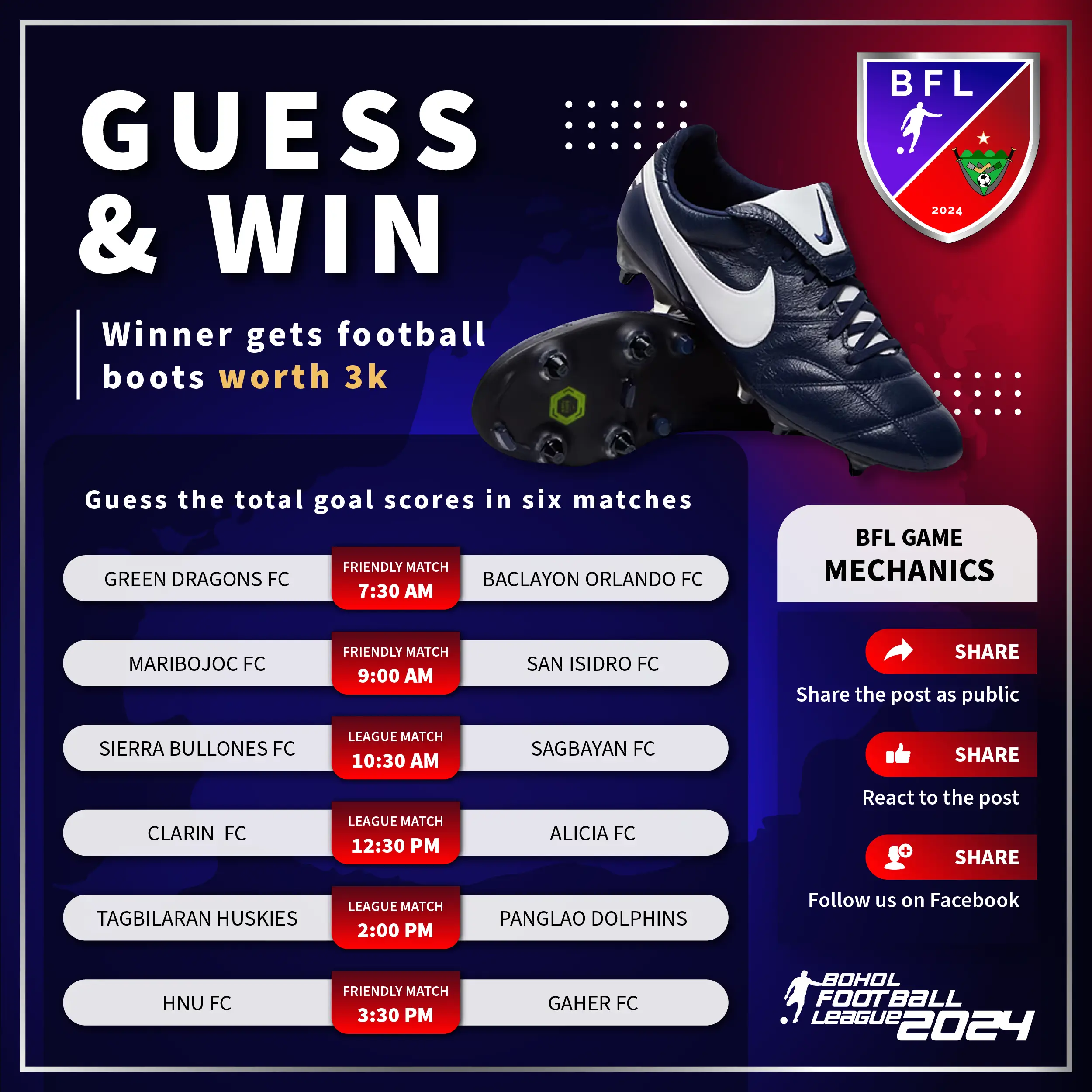 Note: The Bohol Football League (BFL) was launched in August 2024, and I began collaborating with them in mid-October 2024. As of November 2024, I’m proud to contribute to their remarkable growth. Their Facebook page, which features live-streamed events, has already surpassed 10,000 followers in just a few months—a testament to the league’s growing popularity and community impact.